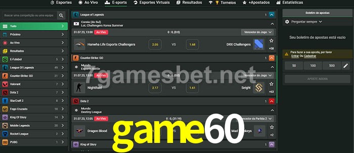 O game60 oferece uma grande seleção de opções de apostas em e-sports com probabilidades competitivas